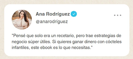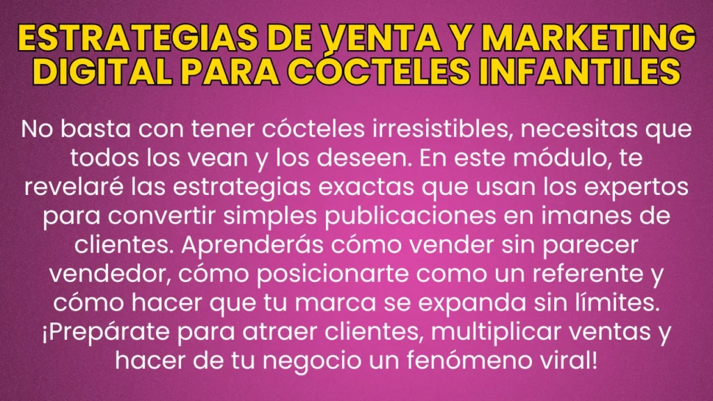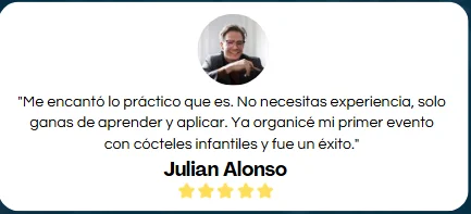 El más completo y estratégico del mercado, con más de 5 módulos detallados, Estrategias de Rentabilidad y Venta de Cócteles, Presentación y Branding de Cócteles Infantiles, Estrategias de Venta y Marketing Digital para Cócteles Infantiles y más, que te ayudarán a transformar tu pasión en un negocio escalable y rentable, permitiéndote ganar hasta $1000 al mes sin experiencia previa.