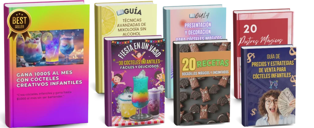 Obtendrás acceso inmediato al ebook «Gana $1000 al Mes con Cócteles Creativos Infantiles» + 6 bonos exclusivos que te enseñarán desde las recetas hasta cómo vender con éxito.