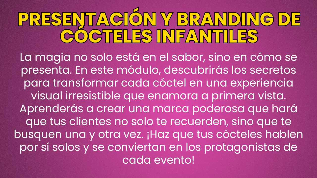 Olvídate de pruebas y errores. Aquí tienes las fórmulas exactas para crear cócteles infantiles irresistibles que encantarán a grandes y chicos. Recetas probadas, combinaciones únicas y presentaciones que venderán por sí solas. ¡Solo sigue el paso a paso y empieza a ganar!